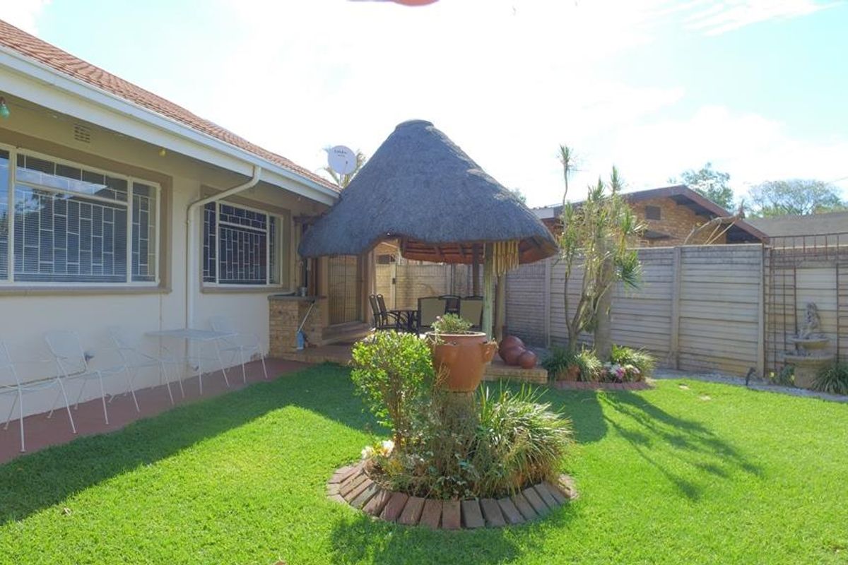 The main house offers a spacious kitchen with under counter oven, stove top and extractor fan, ample cupboards and counter space. The kitchen opens up to the first lapa, that has a built in jacuzzi and bar area. The living area opens up to the second lapa in the back yard. There is 3 spacious bedrooms, all with built in cupboards and the main bedroom has an en-suit bathroom. There is a guest bathroom as well.
