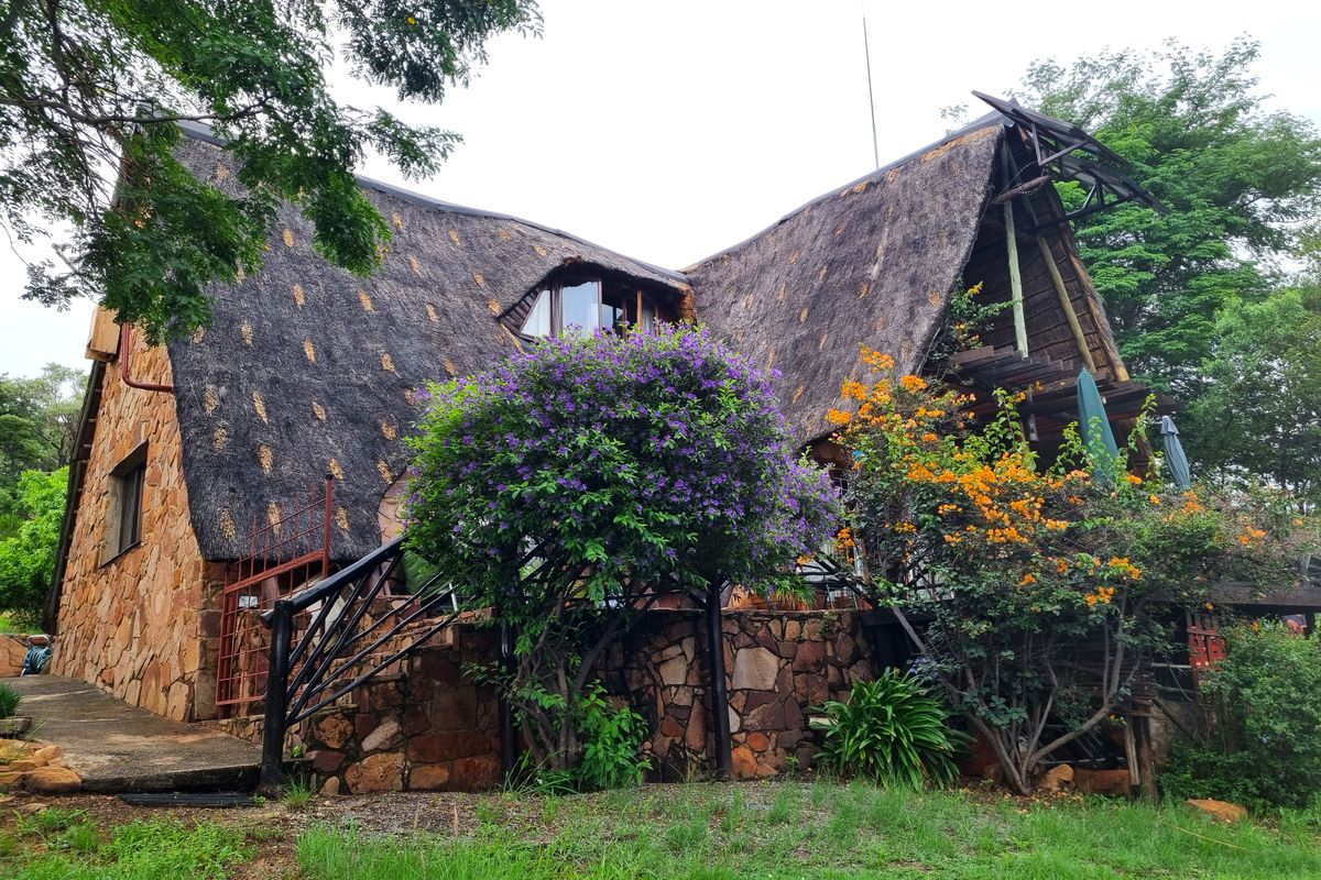 Bushveld living with rental income potential in Utopia Nature Estate, overlooking Buffelspoort Dam and Magaliesberg. Features a balcony with dam views, outdoor shower, and three bedrooms.