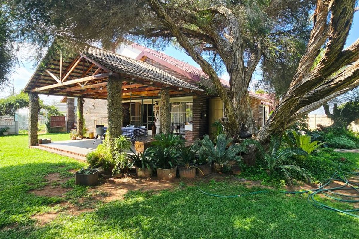 Family-focused living in Stilfontein Ext. 4 with a generous garden and patio for entertaining, multiple living areas and fireplace; study converts to fifth bedroom, four bedrooms, three bathrooms.