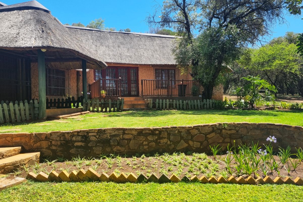 Escape to country living between Rustenburg and Swartruggens with koppie-top views and game drives; main thatch home features indoor braai, pool and five bedrooms.