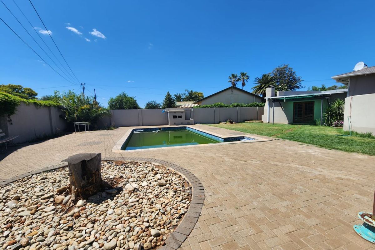 Well-maintained three-bedroom, two-bathroom family home with guest toilet, situated in a quiet and sought-after area. Features an open-plan lounge, dining room and kitchen with built-in cupboards, under-counter oven, hob, and breakfast nook, as well as an outside laundry. The entertainment area includes a built-in braai, leading to a sparkling swimming pool — ideal for family gatherings.