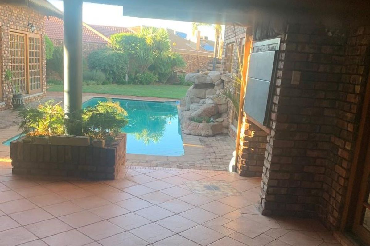 The main home features 4 spacious bedrooms, including en-suite bathrooms, multiple living areas, a dedicated study, and beautiful tiled finishes throughout. Entertain with ease at the built-in braai and bar, or relax beside the sparkling swimming pool surrounded by a private garden.