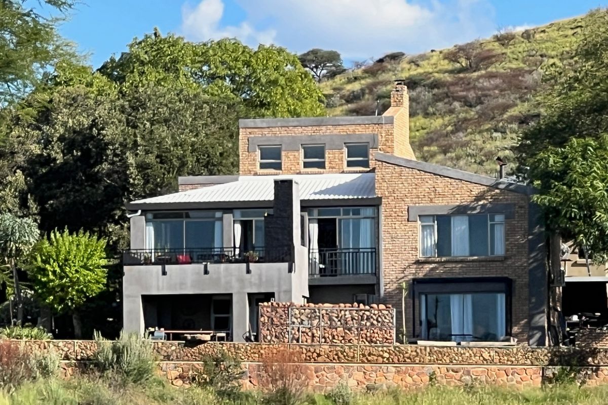 Karoo retreat in quiet Vanderkloof cul-de-sac overlooking Vanderkloof Dam and Rolfontein Reserve — modern industrial double-storey with top-deck braai, ideal guest-house; five bedrooms, four baths.