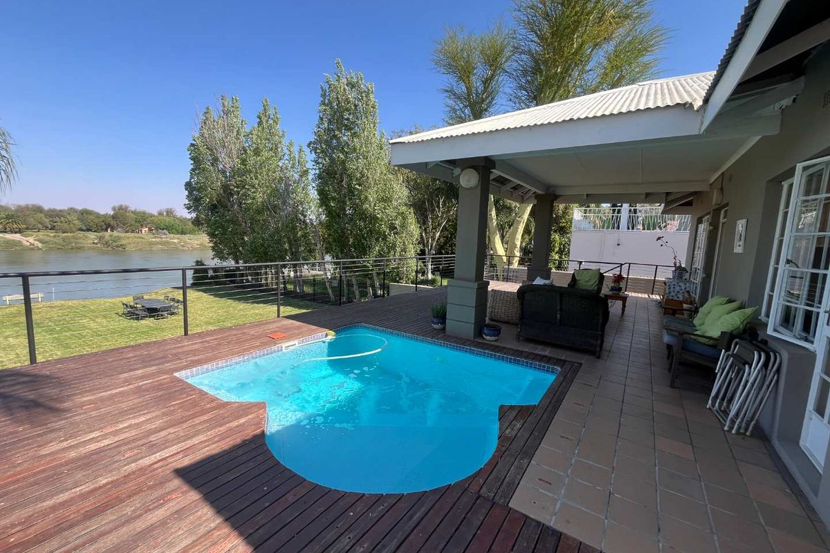 Riverbank retreat on the Orange River with timber floors, decking and splash pool overlooking manicured gardens; versatile cellar with wine room and study — 3 beds, 2 baths, double garage.