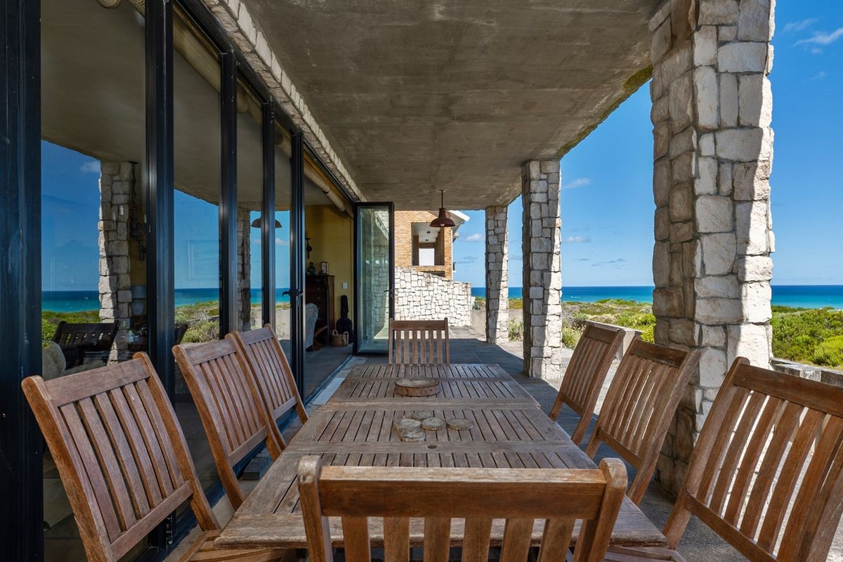 Tranquil coastal retreat with uninterrupted ocean and Agulhas Lighthouse views, established garden and water feature, upstairs library with wood-burning fireplace, plus three bedrooms, three bathrooms and double garage.