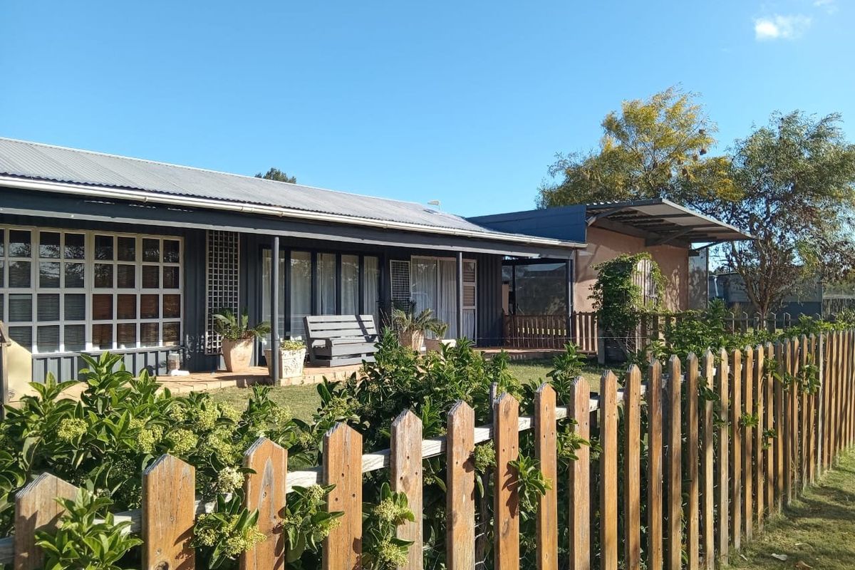 Embrace self-sufficient country living 4km from Albertinia with coastal towns nearby; 250 m² shaded vegetable garden and 58 m² hydroponic greenhouse, solar power, mountain views, three-bedroom, two-bath home.