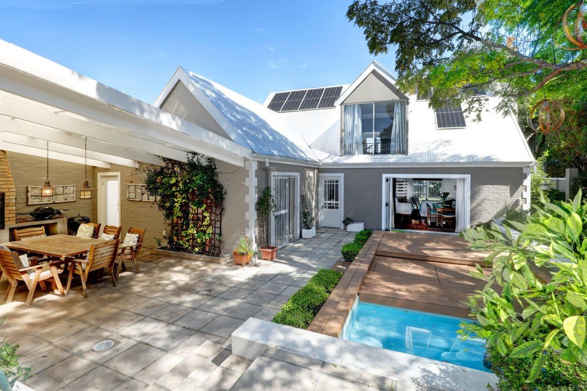 Leafy De Bron living — relaxed family entertaining around a pool and undercover braai stoep, set in mature gardens with vineyard views; three bedrooms, two bathrooms and double garage.