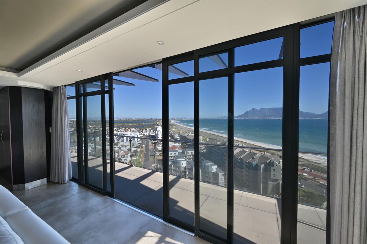Set high above the iconic Blouberg beachfront, this luxurious top-floor penthouse captures uninterrupted 360-degree views of Table Mountain, Robben Island, and the Atlantic Ocean.