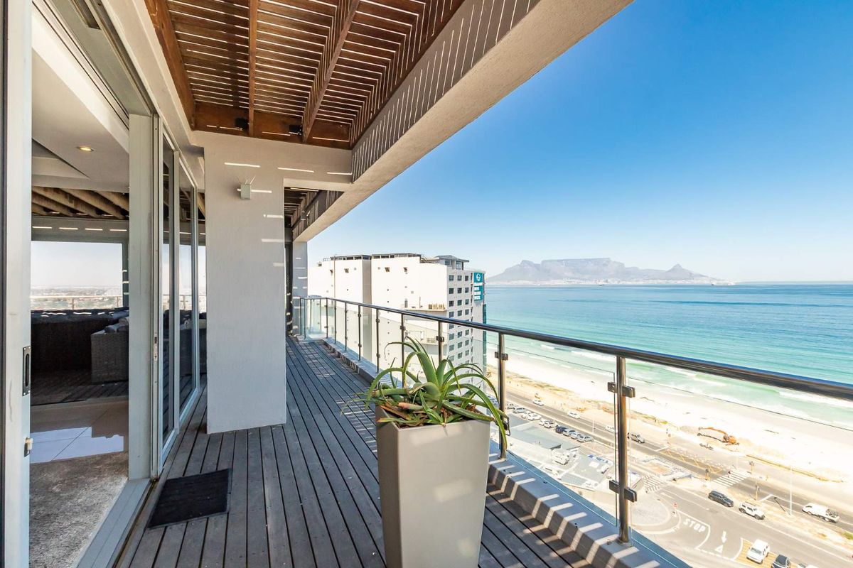 Embrace coastal penthouse living in Cape Town with iconic Table Mountain and Robben Island views, wrap-around terrace with private Jacuzzi — four en-suite bedrooms and secure parking.