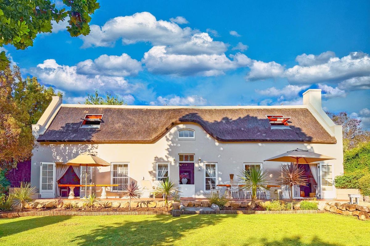 Retreat to Greyton's nature reserve edge in a thatched Cape Dutch homestead with a private stream, irrigated oak gardens and a covered braai courtyard — five bedrooms, double garage.