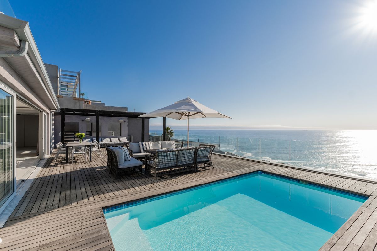Seaside entertaining lifestyle in Wind-Free Bantry Bay with expansive entertainment deck boasting a pool, jacuzzi and braai; private lift access to three en-suite bedrooms and double garage.