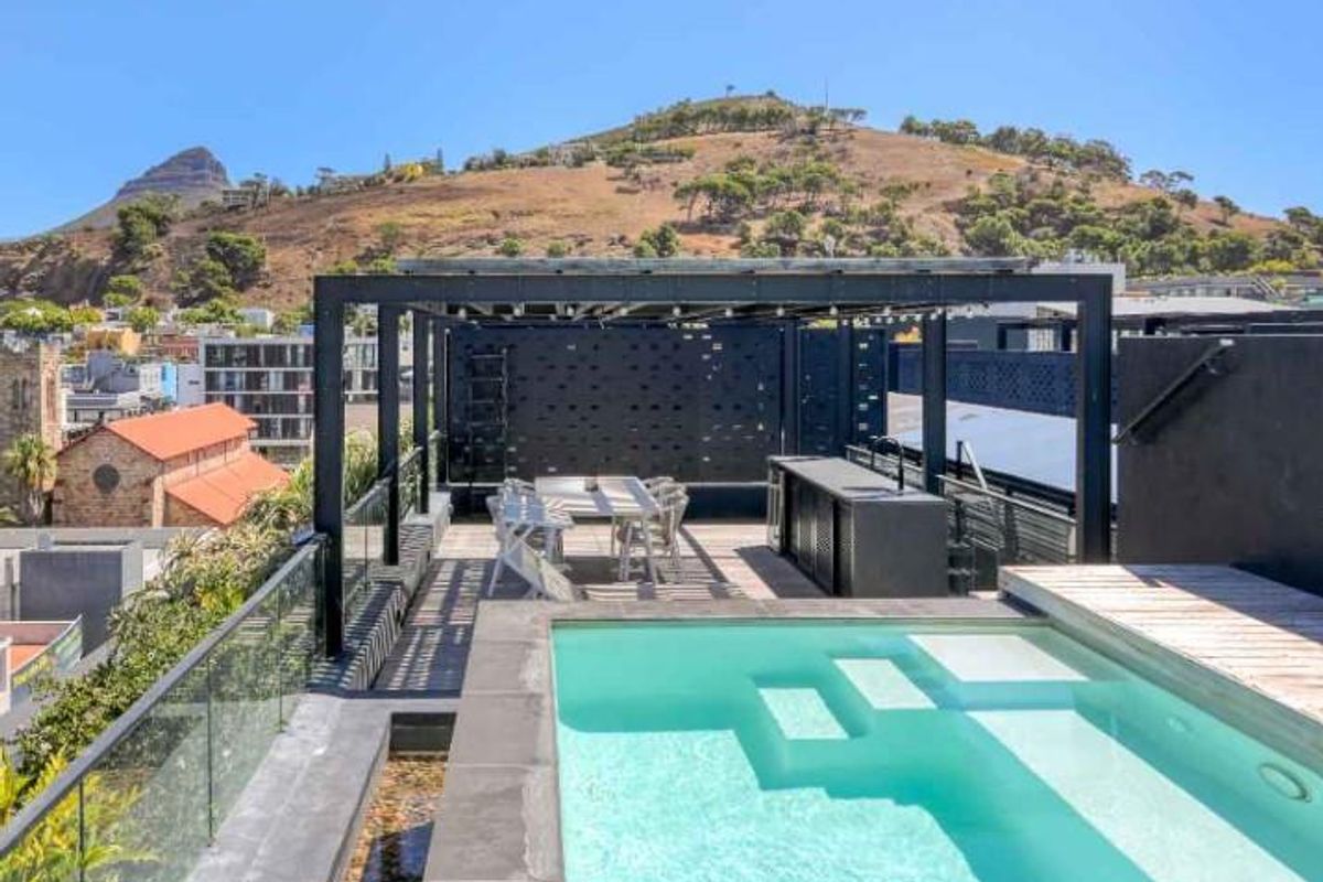 Sip sundowners on your private 100sqm rooftop pool terrace with panoramic Table Mountain views in De Waterkant, steps from the V&A Waterfront — Airbnb-ready, 2 beds, 2 baths, 2 parking.