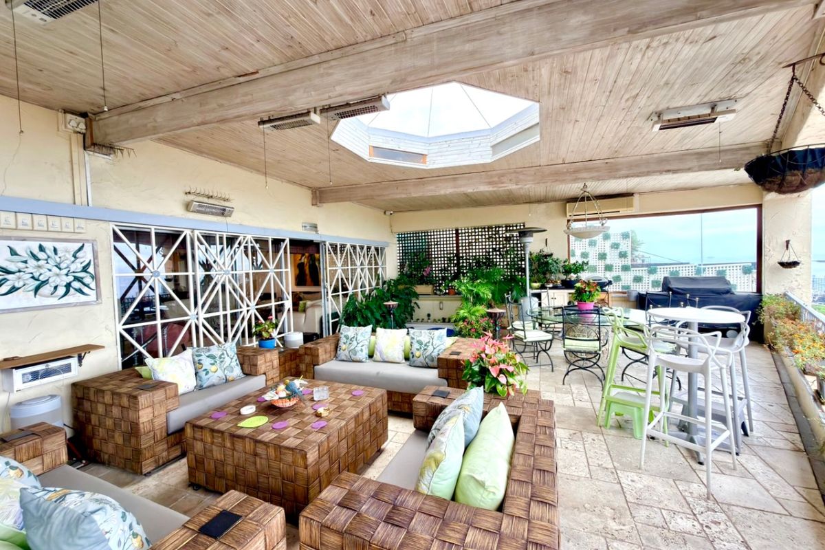 Two expansive outdoor living spaces offers comfortable seating and stunning vistas. One features a covered area with gray couches and a skylight, while the other has wicker furniture.