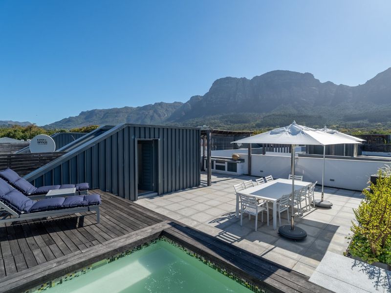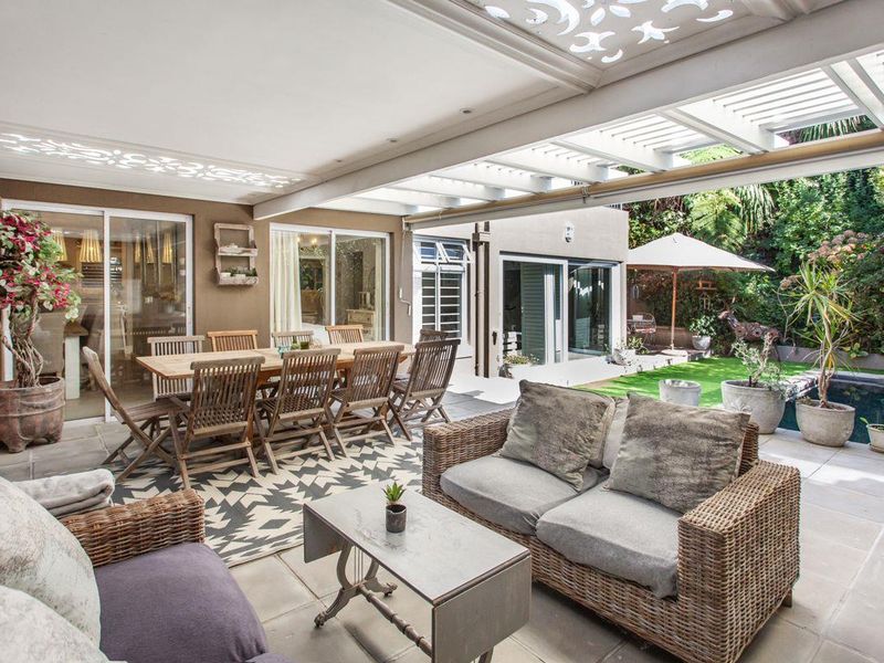 Sunlit garden home opposite the Vineyard Hotel, steps to Newlands Village and Cavendish Square, with pool, mountain views and self-contained studio — 4 beds, 3 baths, 3-car garage.