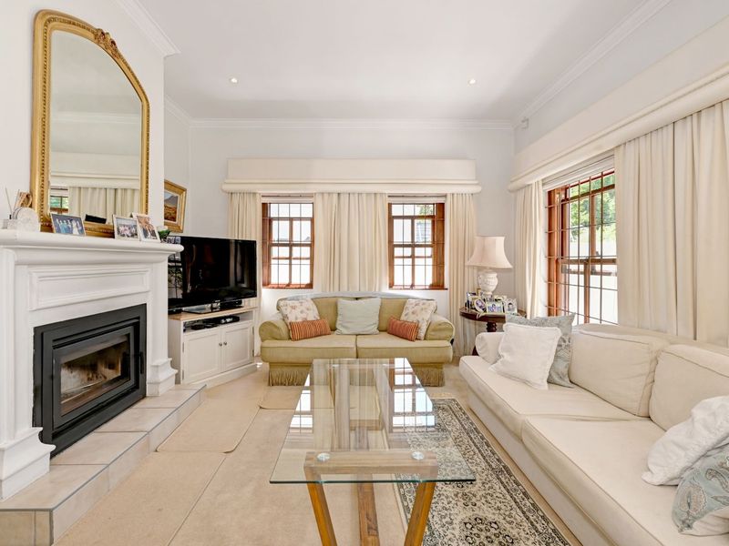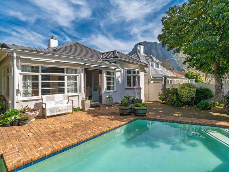 Family-focused home near the M3 with easy Constantia schooling access, private garden and pool with mountain views, open living with fireplace, three bedrooms and double garage.