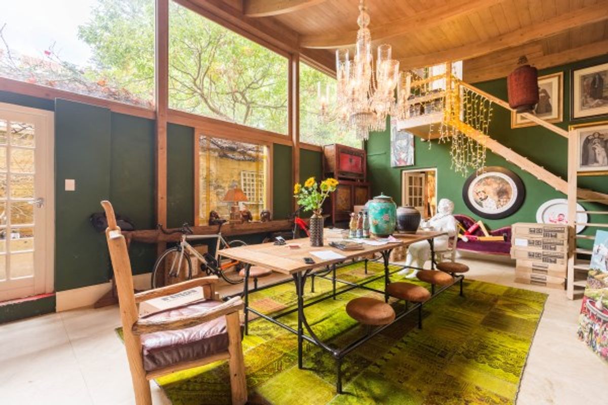 At the south end, a living area with a curved wooden ceiling, a magnificent chandelier, and direct access to the garden and the roof showcases breathtaking views of Table Mountain. The compact kitchen and convenient parking for two cars complete this captivating property. Offering excellent security and set in a private, forested garden in the heart of the city bowl.
