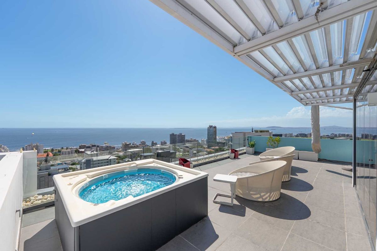 Elevated seaside living with effortless entertaining above the Atlantic Seaboard in Sea Point, featuring a wraparound terrace, private lift, three en-suite bedrooms and three parking bays.