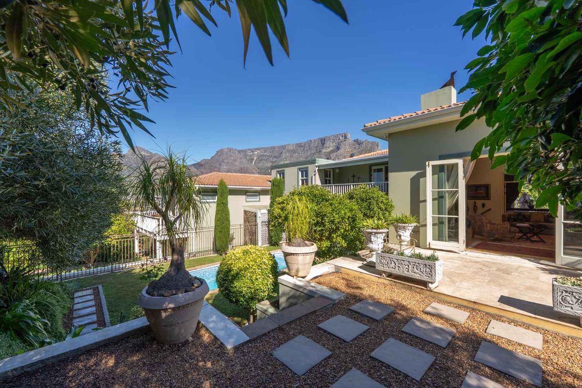 Leafy Tamboerskloof living with city and mountain views — north-facing decks and French doors to garden, flexible layout plus self-contained studio with private entrance; 5 beds, 3 baths, double garage.