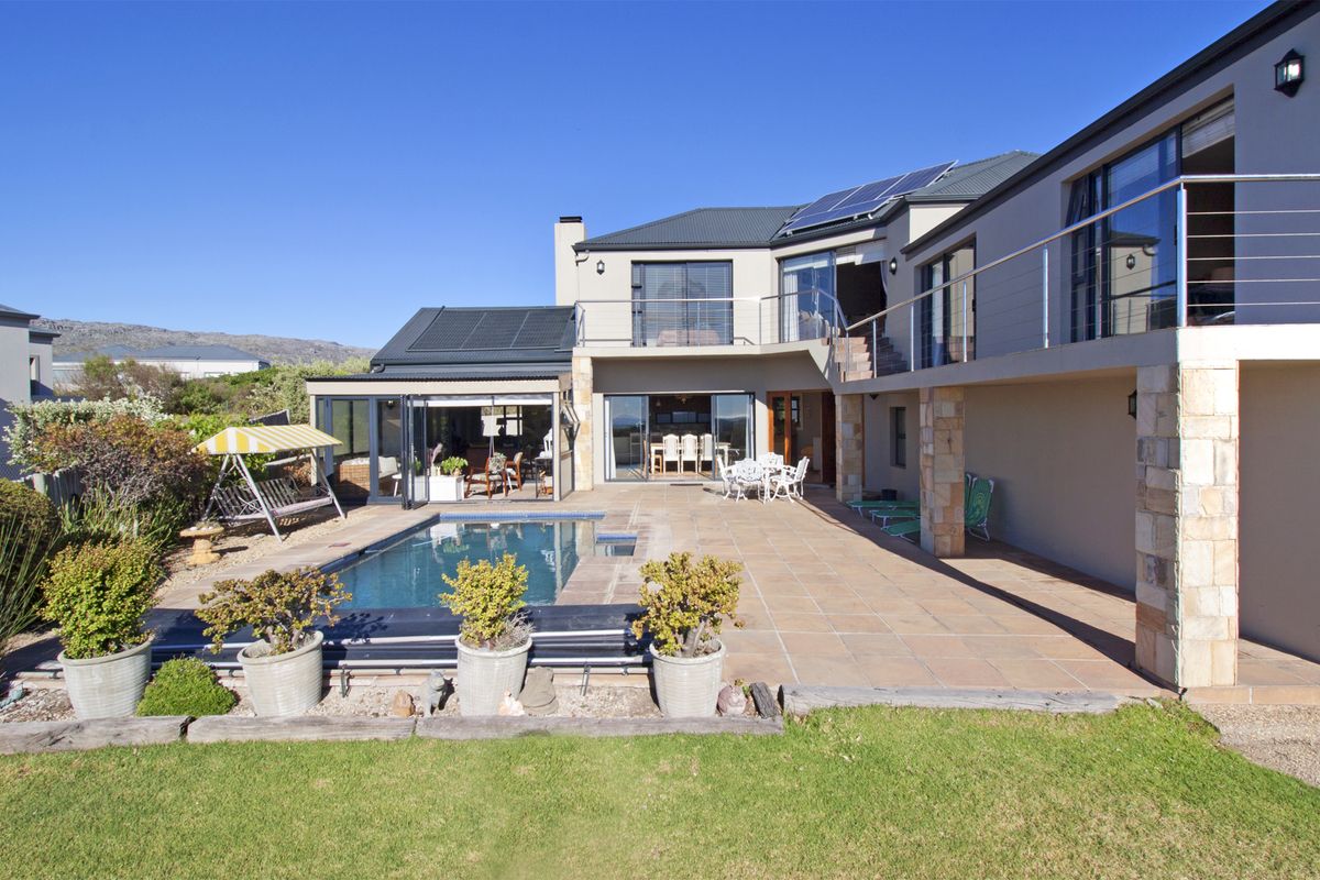 Coastal family living with panoramic Long Beach and Chapman’s Peak views in Stonehaven Estate; stacking doors open to pool and garden, plus indoor braai, four beds, double garage.