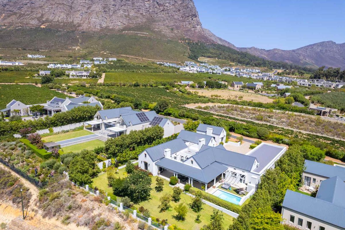 Embrace Winelands living minutes from Franschhoek village, entertaining on a covered patio with a wood-fired pizza oven — three bedrooms, five bathrooms and three garages.