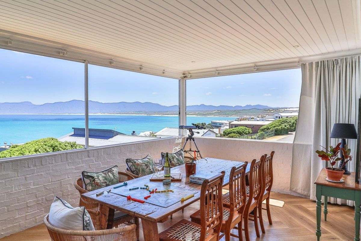 Coastal entertainer’s retreat in De Kelders, steps from Stanfords Cove and whale-watching; dual-living layout with private garden and boma, 180-degree ocean views, four bedrooms, four bathrooms, double garage.