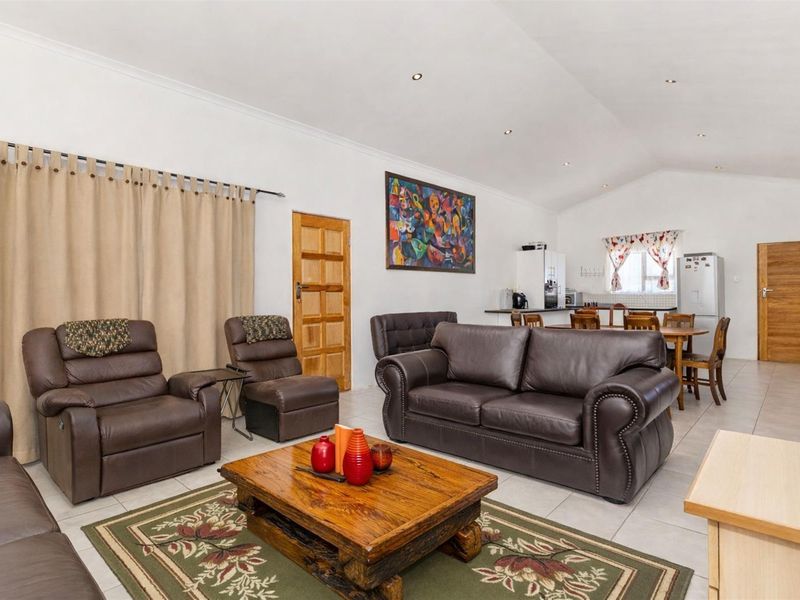 Relaxed coastal family living in Franskraal where friends linger — open-plan entertaining with bar and balcony mountain views, plus a separate three-bedroom flatlet; five beds, three baths, double garage.