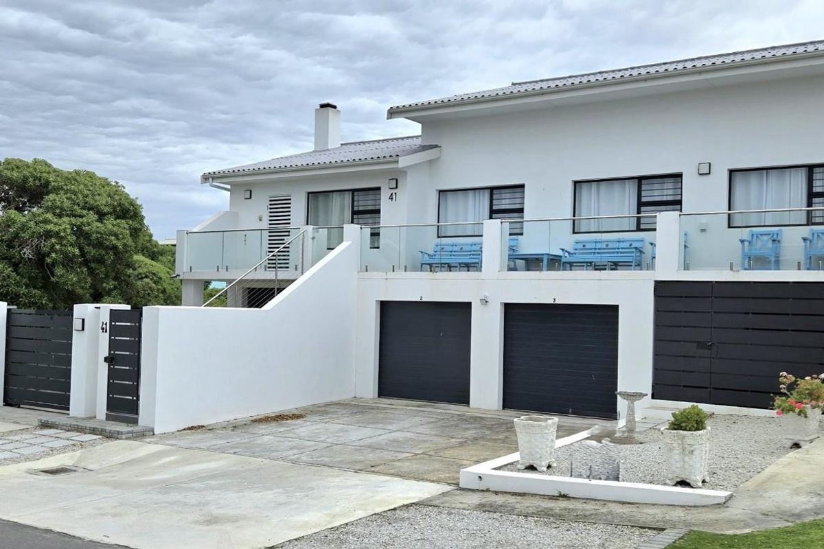 Seaside retreat in Franskraal with long sandy beaches and whale watching nearby; renovated home featuring panoramic ocean views and a gourmet kitchen — five bedrooms and three automated garages.
