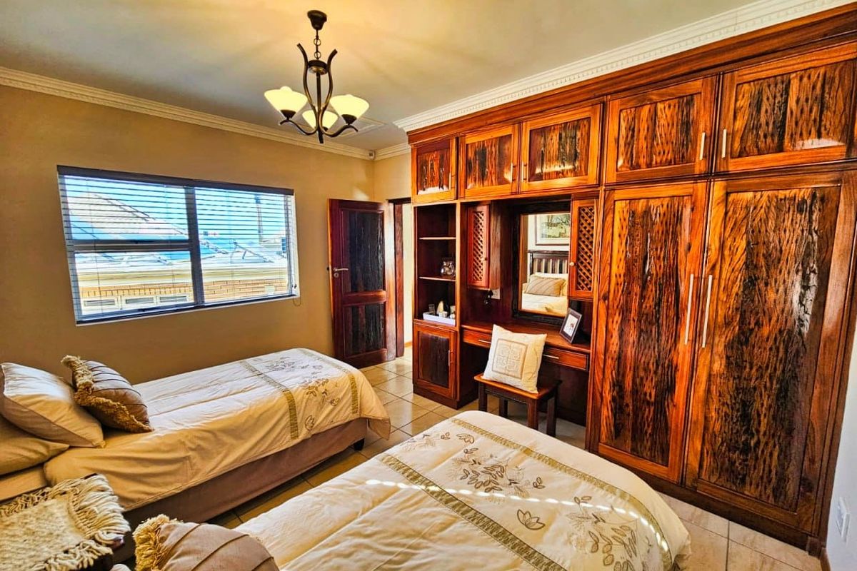 Ocean-view entertainer in tranquil Herolds Bay cul-de-sac, featuring a 180° music-ready entertainment level, Rhodesian teak floors, separate two-bedroom flatlet, 4 beds, 5 baths, 2 garages.