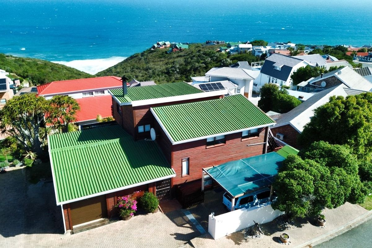 This stunning 4-bedroom house in Herolds Bay offers breathtaking ocean views and a perfect coastal lifestyle. As you enter, you'll find a welcoming entrance hall that opens to a spacious lounge with a balcony, where you can enjoy the sound of the waves and the sea breeze. From here, steps lead down to the lush garden, creating an ideal outdoor retreat.