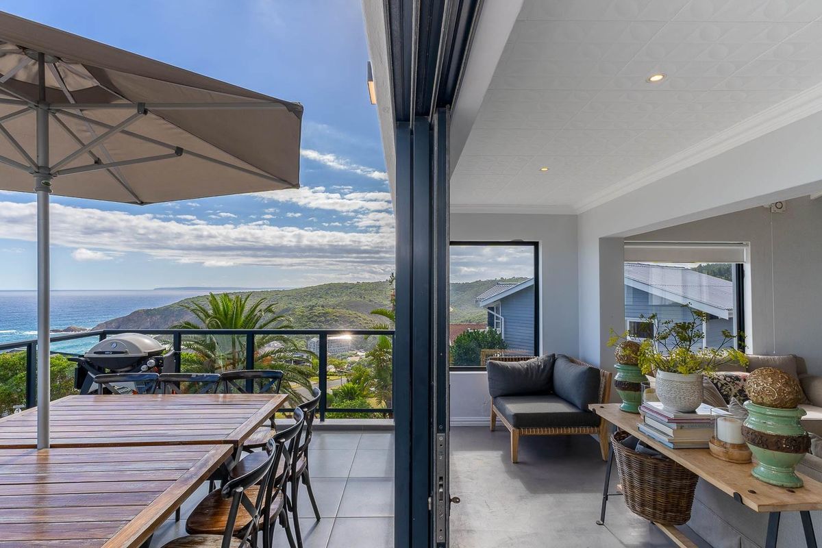 Coastal family entertaining on the Garden Route with panoramic ocean views, balcony braai space, modern kitchen and self-contained apartment — six bedrooms, three bathrooms near Herolds Bay beach.