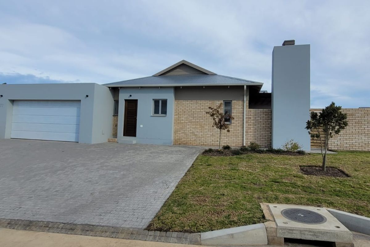 Relaxed Garden Route lifestyle in Mooikloof Country Estate, Hansmoeskraal, with private garden and built-in braai, modern quartz kitchen, double garage, three bedrooms, two baths.