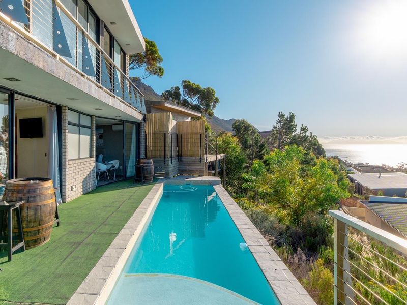 Coastal entertaining and relaxed family living in Gordon's Bay, capturing panoramic Helderberg and False Bay views, with two kitchens, indoor braai, bar area, and six en-suite bedrooms.