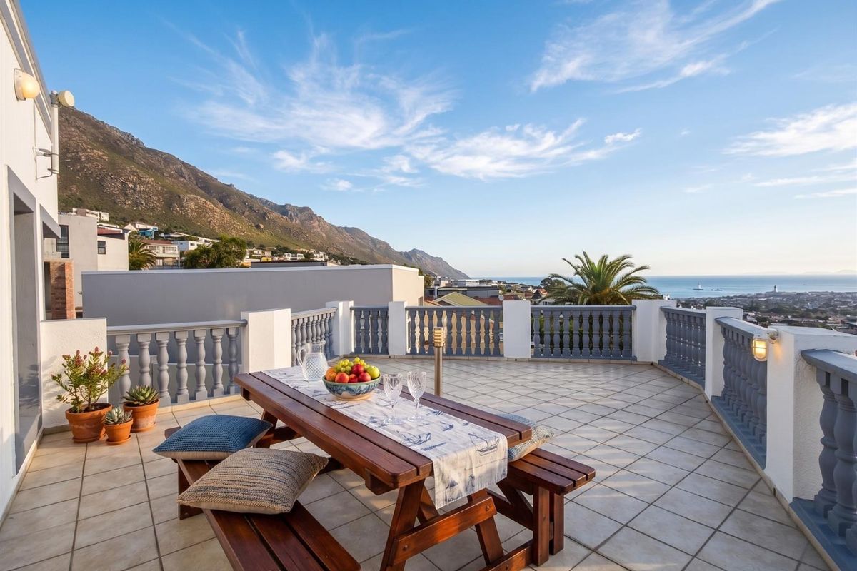 Elevated coastal living with panoramic False Bay and mountain views in Gordon’s Bay's Mountainside, featuring wrap-around balconies and five bedrooms with four extra-length garages.