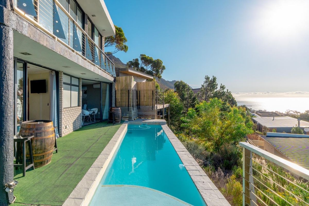 Coastal entertaining and relaxed family living in Gordon's Bay, capturing panoramic Helderberg and False Bay views, with two kitchens, indoor braai, bar area, and six en-suite bedrooms.