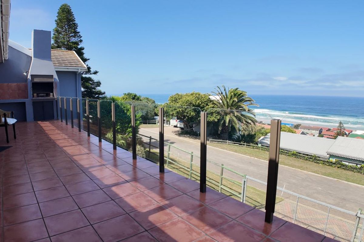 Seaside entertaining lifestyle in Dwarswegstrand on the Garden Route, between George and Mossel Bay — balcony with ocean views and built-in braai, open-plan kitchen, five bedrooms, two garages.
