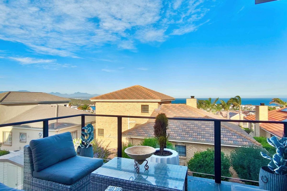 Entertainers' coastal retreat in Hartenbos Heuwels, Mossel Bay, with a private courtyard and built-in braai; sea and mountain views from upstairs; three bedrooms, 3.5 baths, double garage.