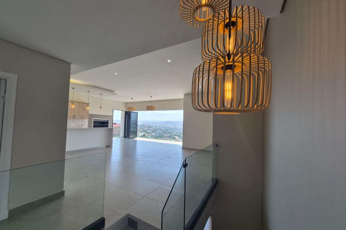Coastal lifestyle in Hartenbos Heuwels near the seafront and Garden Walk Mall, balcony with panoramic Hartenbos River and Outeniqua Mountain views, modern kitchen and stylish open-plan living.