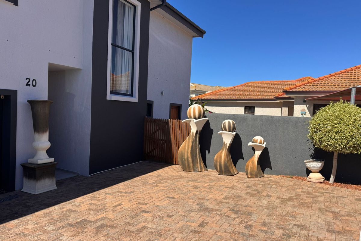 Coastal neighborhood living with panoramic sea views from multiple balconies, light-filled interiors and indoor braai. Turn-key four-bedroom home with three bathrooms, ample parking, solar and rainwater tank.