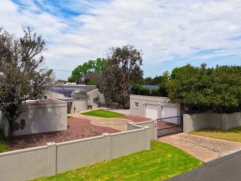 Entertainer's coastal estate in Hermanus, moments from whale-watching shores, set on private gardens with pool and terraces — five bedrooms, 5.5 baths and triple garage.