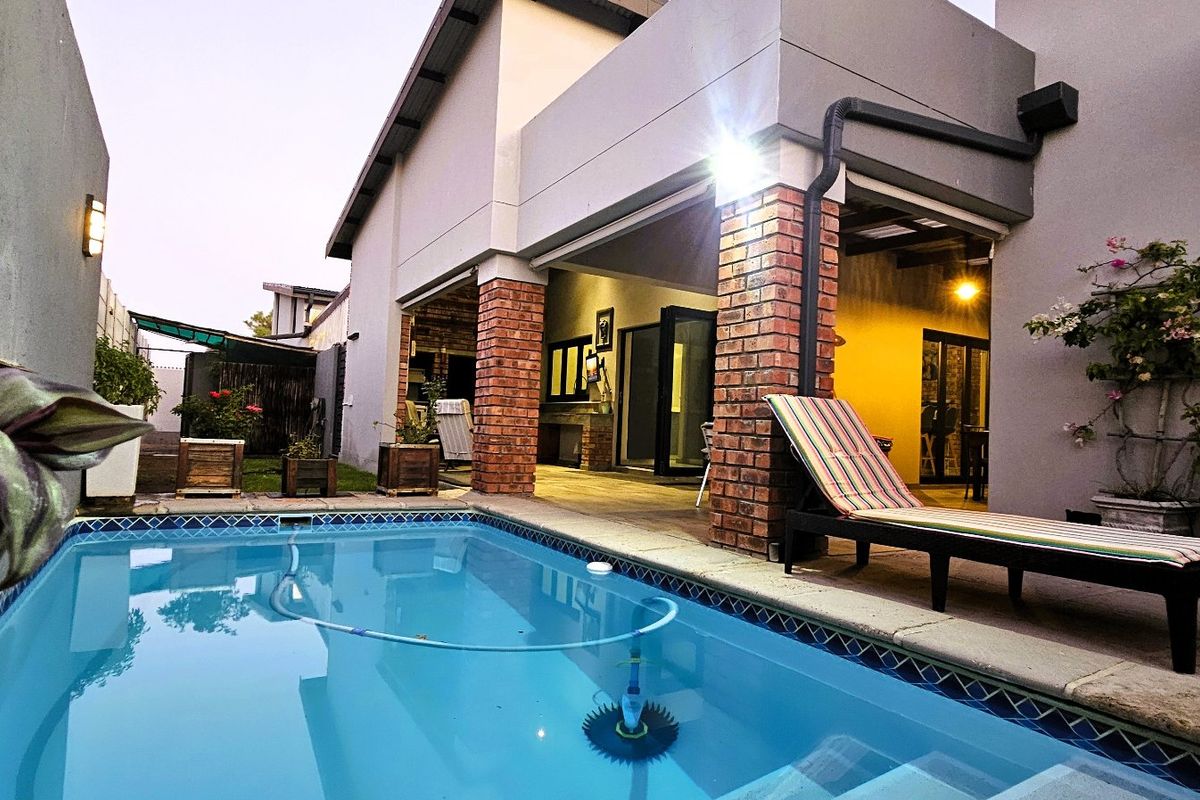 The open-plan kitchen includes a separate scullery and connects easily to the lounge area, where a striking fireplace adds warmth and character. A private courtyard separates the living areas and leads out to the swimming pool and outdoor patio — creating a lovely indoor-outdoor lifestyle ideal for entertaining or simply relaxing at home.