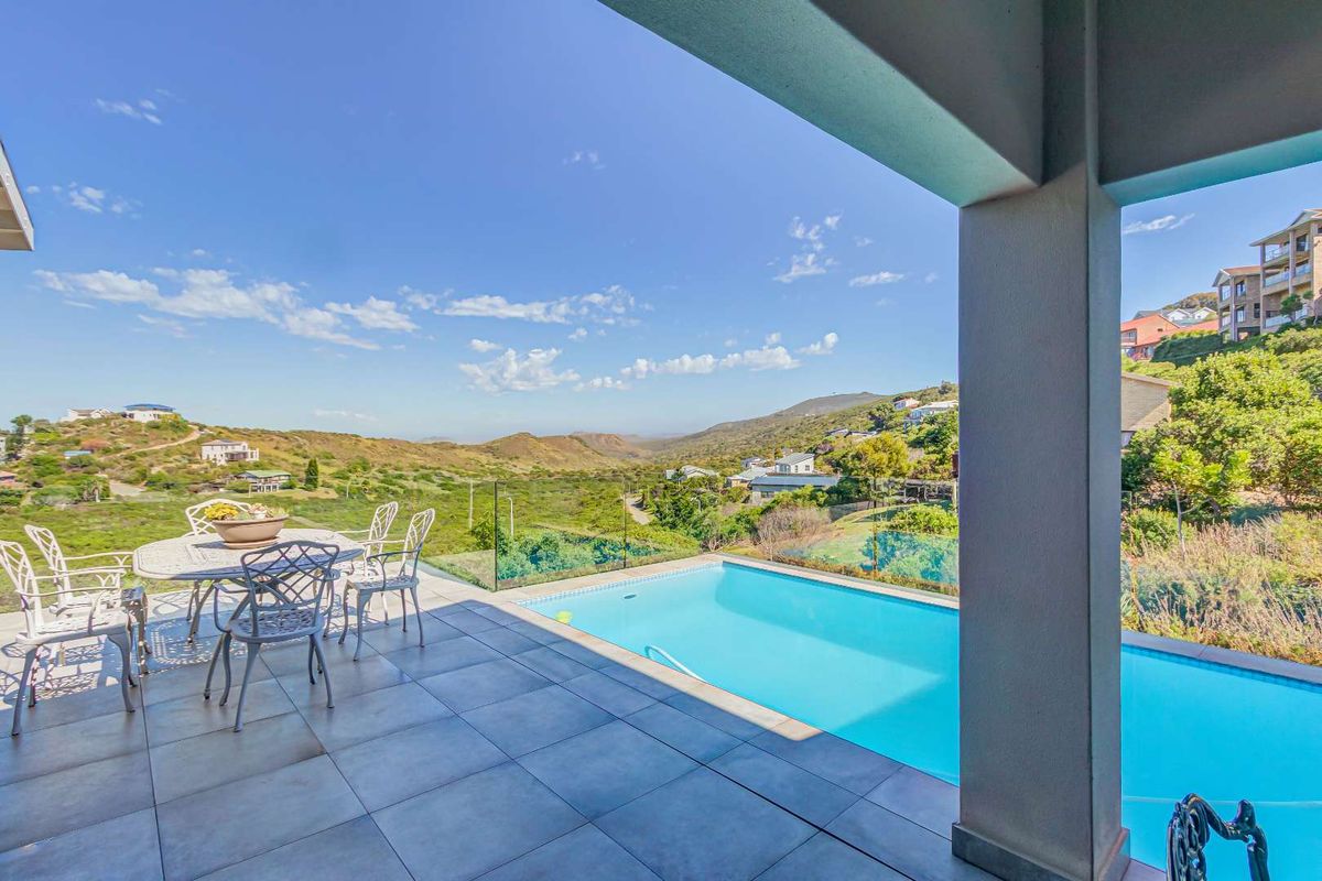 The home is designed for easy, single-level living, with all the main living areas and bedrooms situated on one level, while the extra-large double garage is positioned below. The living space flows comfortably out to a partially covered patio with a built-in braai and swimming pool, creating a natural extension of the home for both everyday living and entertaining. From here, the property enjoys a lovely outlook across the valley towards Buffelsbaai, with distant ocean views and beautiful sunsets over the fynbos landscape.