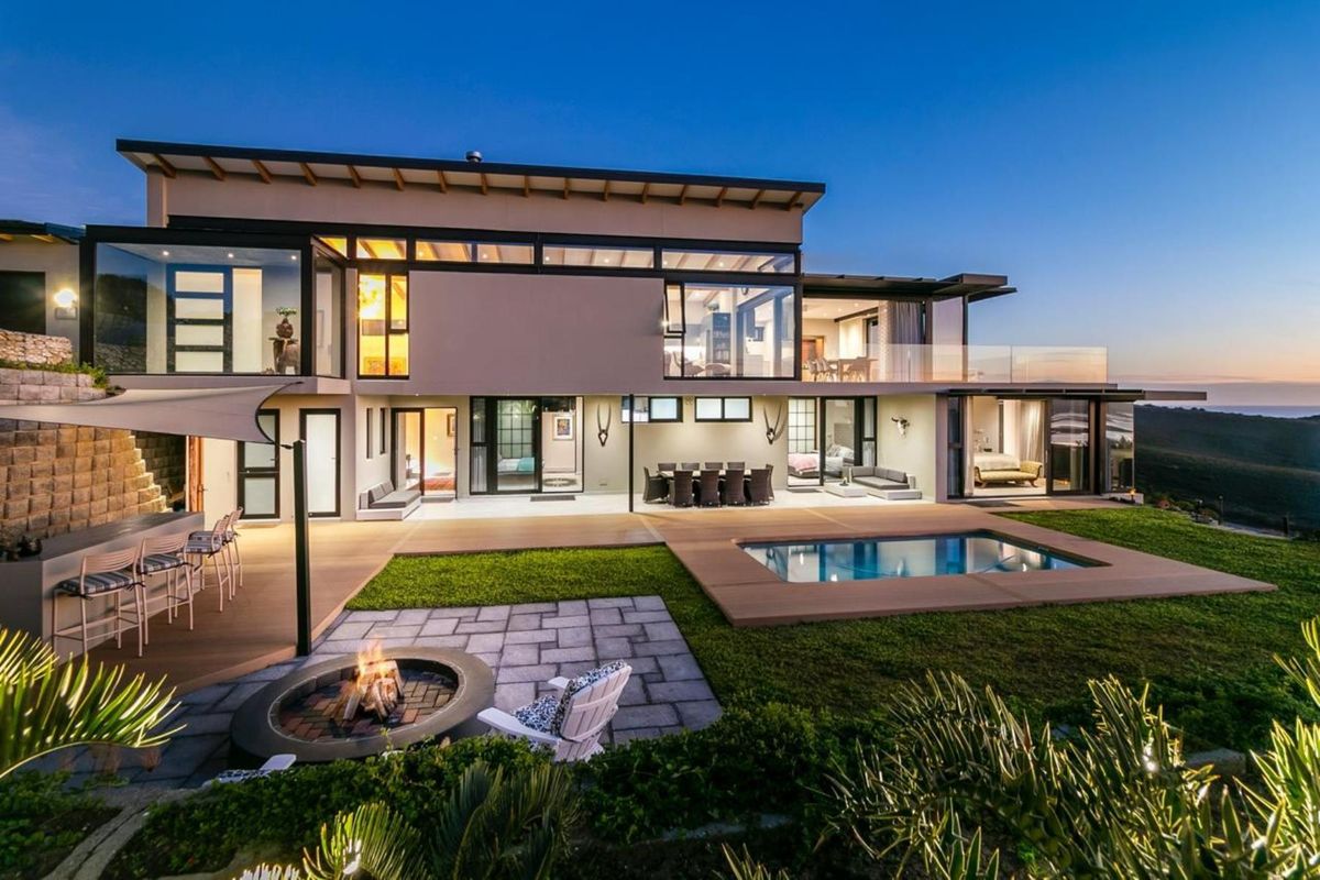 Entertainer's retreat high on Fernwood Private Estate with uninterrupted Knysna Lagoon and Outeniqua Mountain views, landscaped garden and heated pool with Tikki Bar and fire-pit; three bedrooms, three baths.