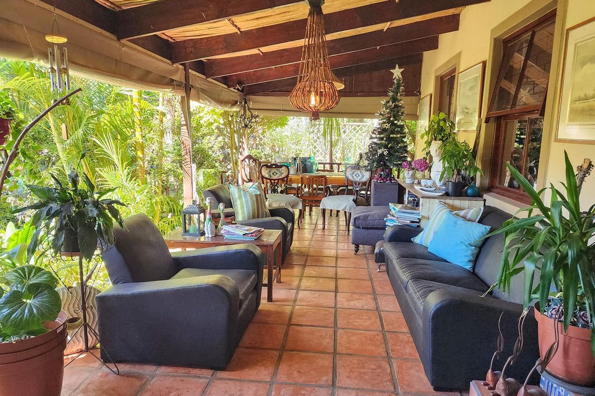 The open plan lounge and dining area, with a woodburning fireplace, flows into the kitchen as well as flowing out onto the private patio with a braai area within another lush corner of the garden.