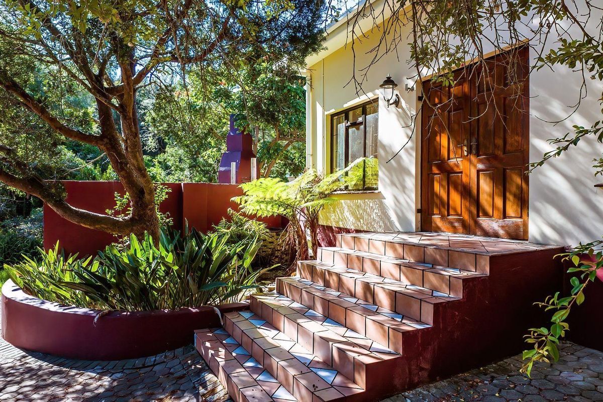 Holiday retreat for relaxed entertaining in Knysna, set in mostly level gardens with a pond and yellowwood trees. Huge indoor entertainment area with built-in braai; three bedrooms, double garage.