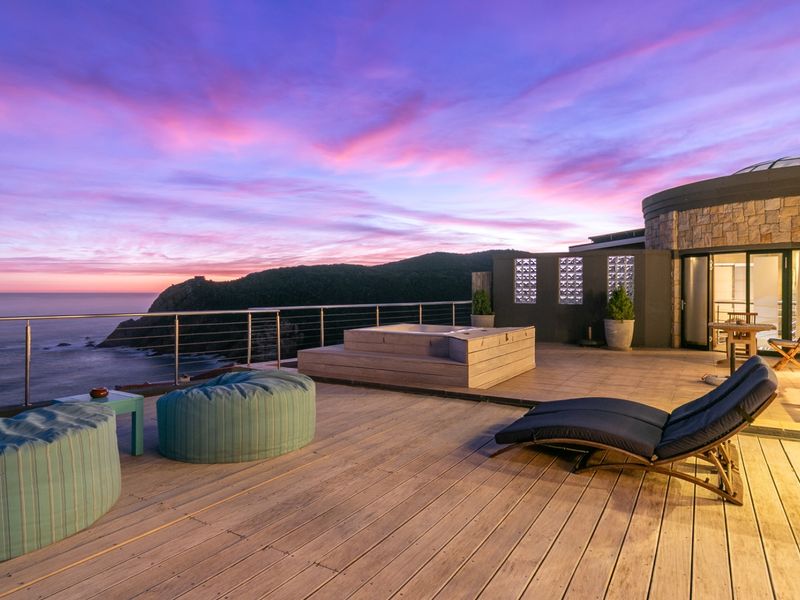 Coastal boutique hospitality at Knysna Heads with panoramic ocean views, Moroccan-style dome and private heated penthouse pool; fully furnished, seven en-suite bedrooms and turnkey, profitable operation.
