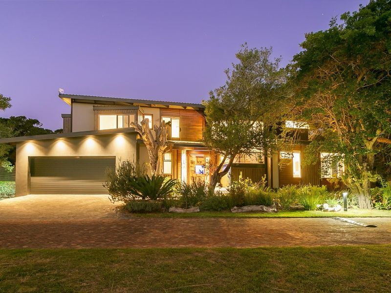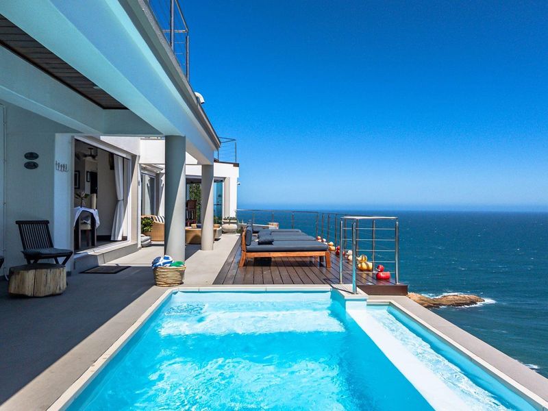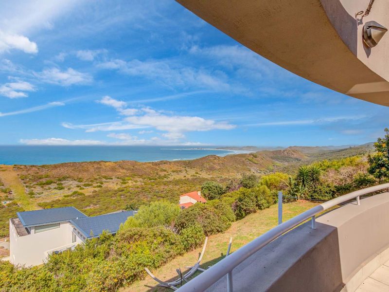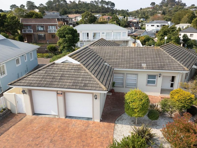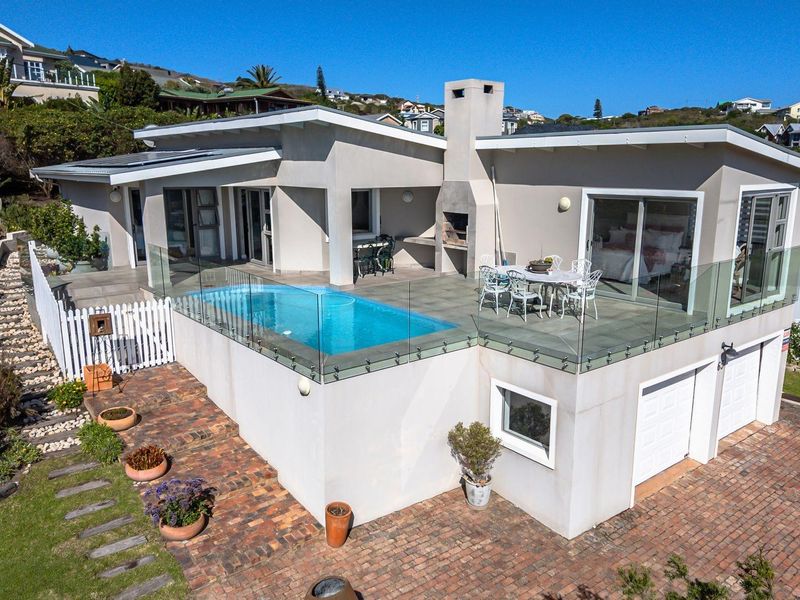 Elevated coastal retreat in Brenton-on-Sea with panoramic Indian Ocean and Buffelsbaai views — watch migrating whales from the balcony; pool and pizza oven with lush garden, six-bedroom layout.