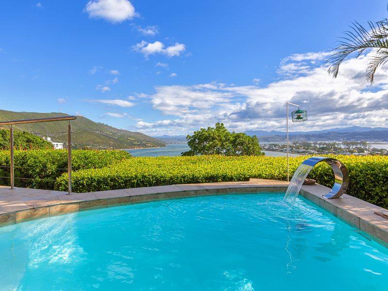 Enjoy hilltop coastal living overlooking the Knysna Estuary and Heads, tucked in a quiet cul-de-sac with a central courtyard, sparkling pool and lush gardens — ideal investment or guesthouse.