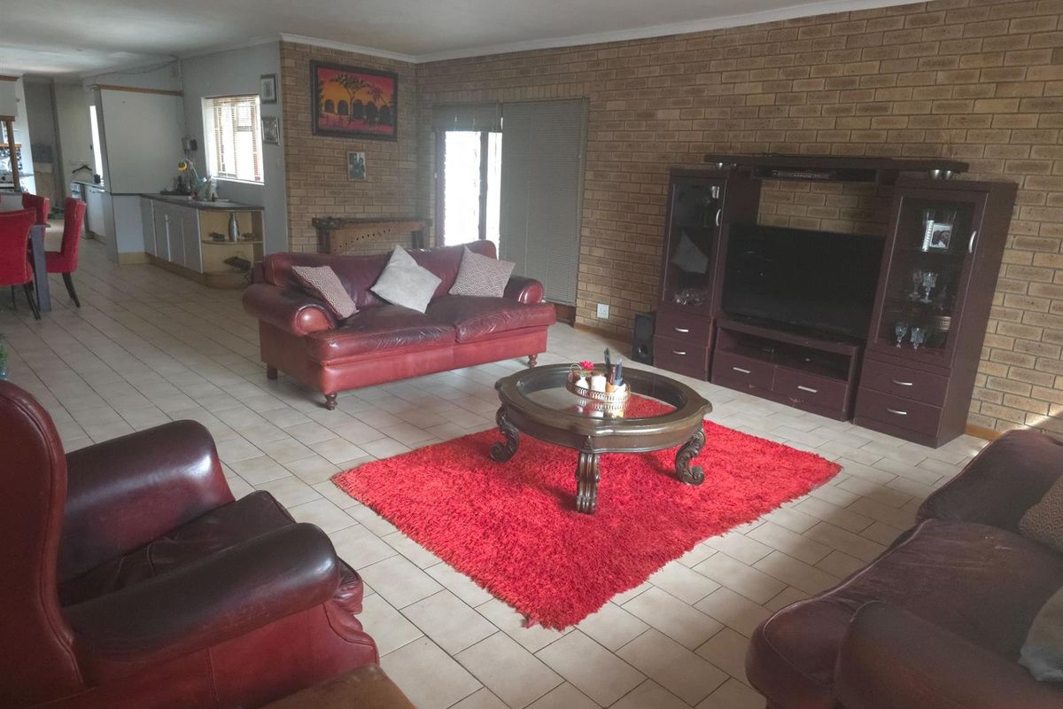 The braai room opens onto a patio, leading to a well-maintained outdoor space featuring a paved area, a small splash pool, lawn, and beautiful shrubs and trees. A borehole ensures the garden stays green year-round without high water costs.
