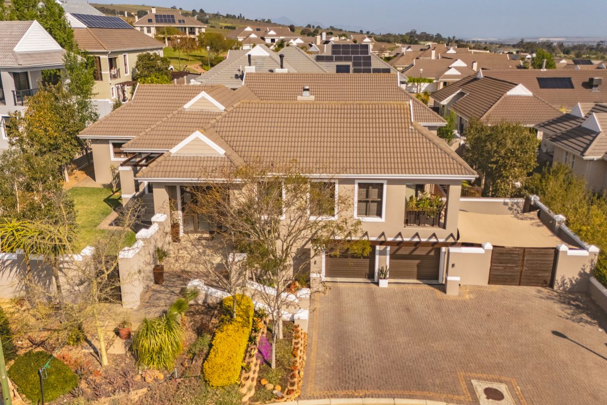 Entertainer's retreat in Zevenwacht Country Estate, Kuils River — enjoy mountain views, landscaped gardens and an indoor-outdoor entertainment area with splash pool. Four bedrooms and a study.