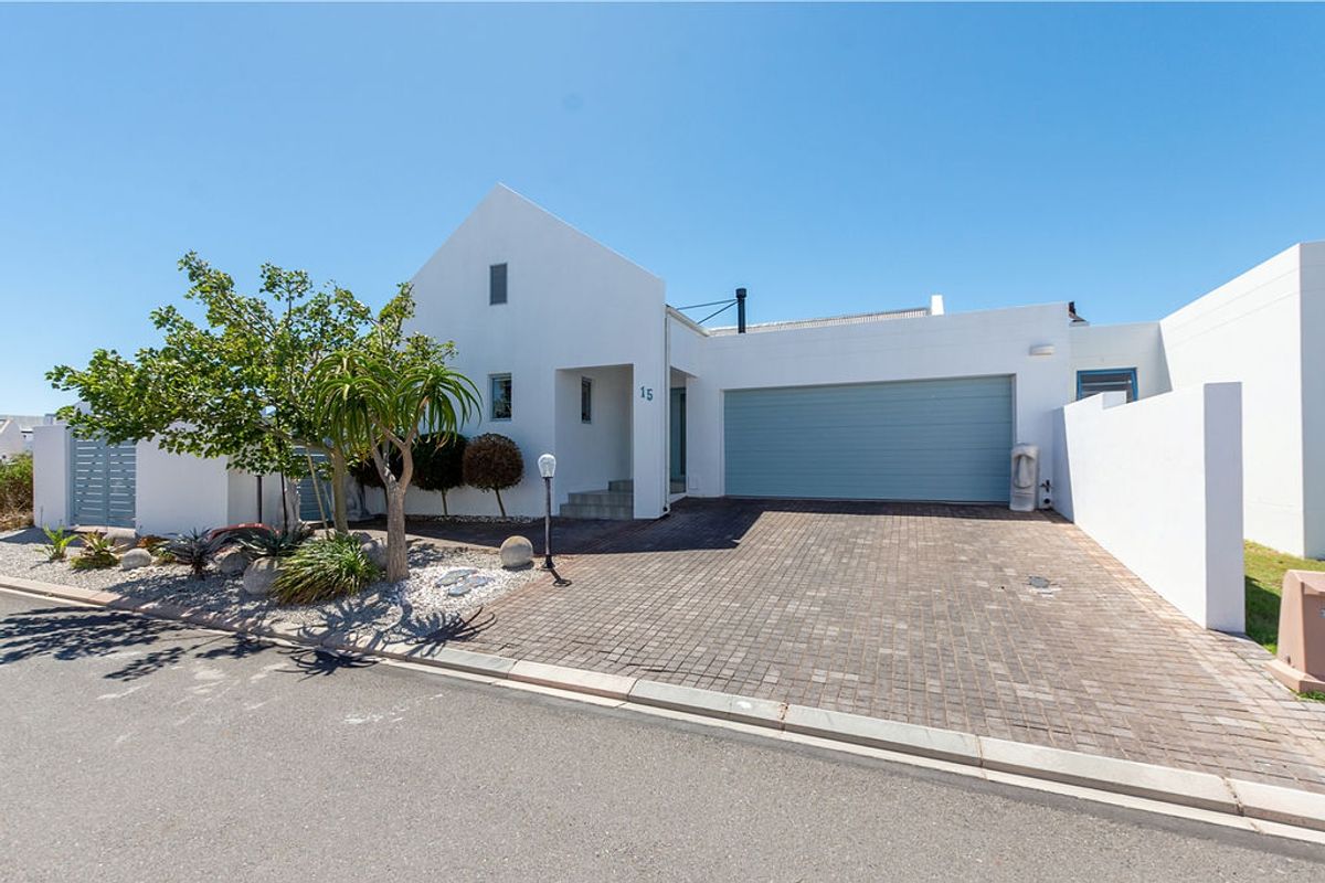 Coastal, walk-to-Calypso-beach living in Blue Lagoon estate, Langebaan, with dramatic double-volume lounge and exposed trusses, north-facing patio for entertaining; three bedrooms, two bathrooms, double garage.